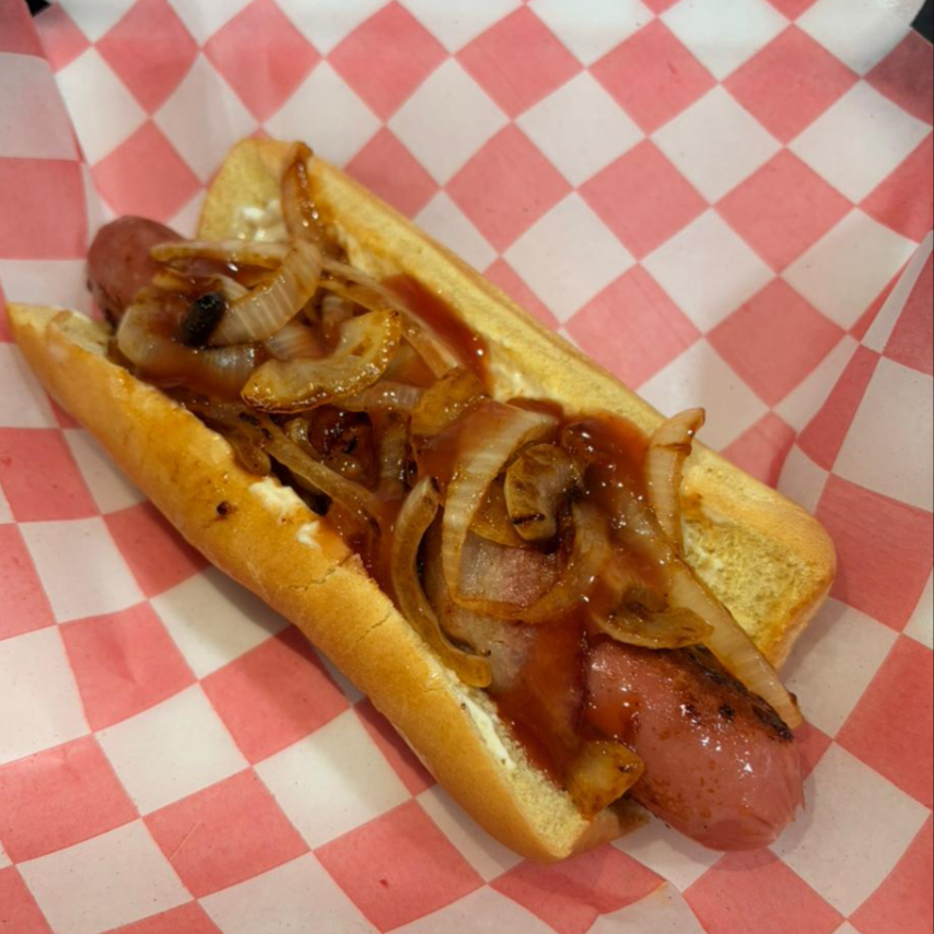 Dogo sencillo con cebolla caramelizada, tocino, cateup