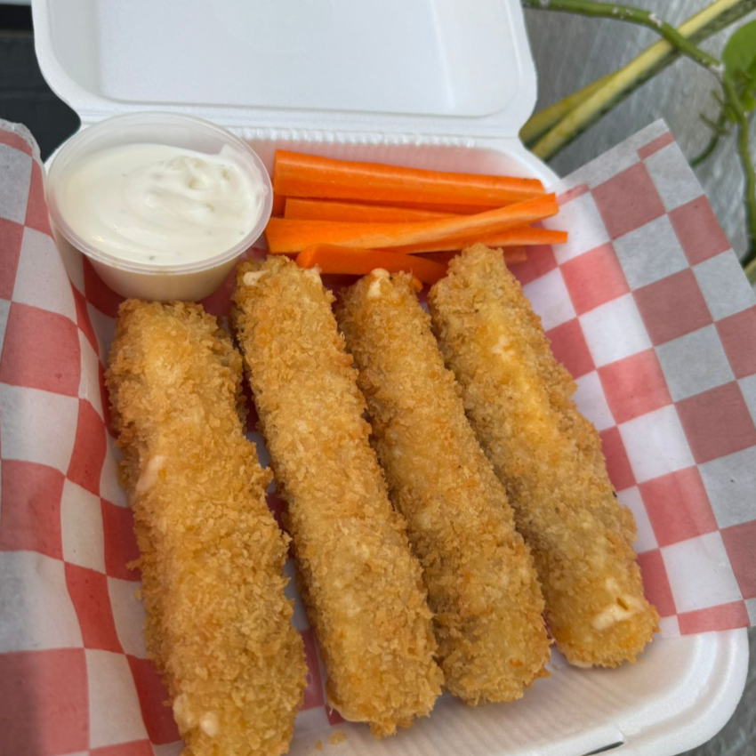 4 pzs de mega dedos de queso gouda, acompañados de bastones de zanahoria, aderezos ranch y bufalo