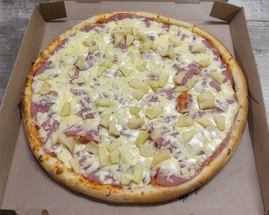 Salsa italiana, jamón, salami, champiñón, pimiento, cebolla y queso gouda más papas a la francesa.