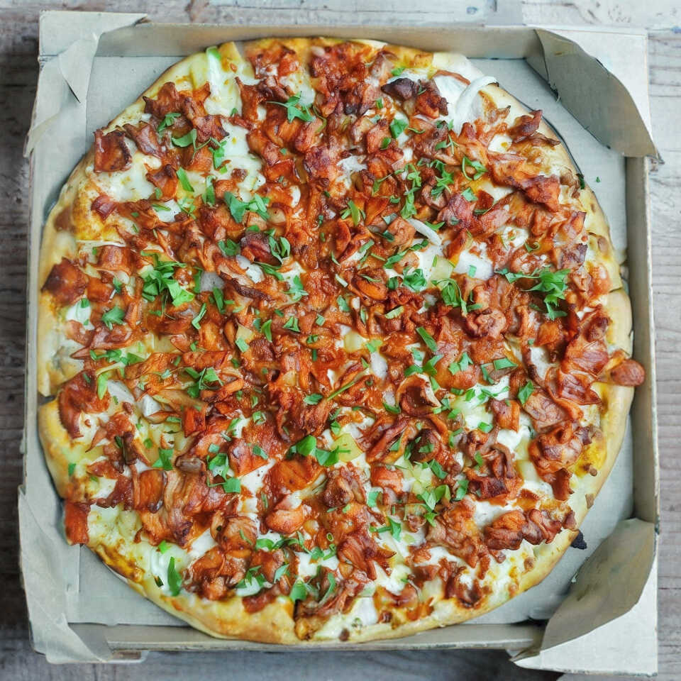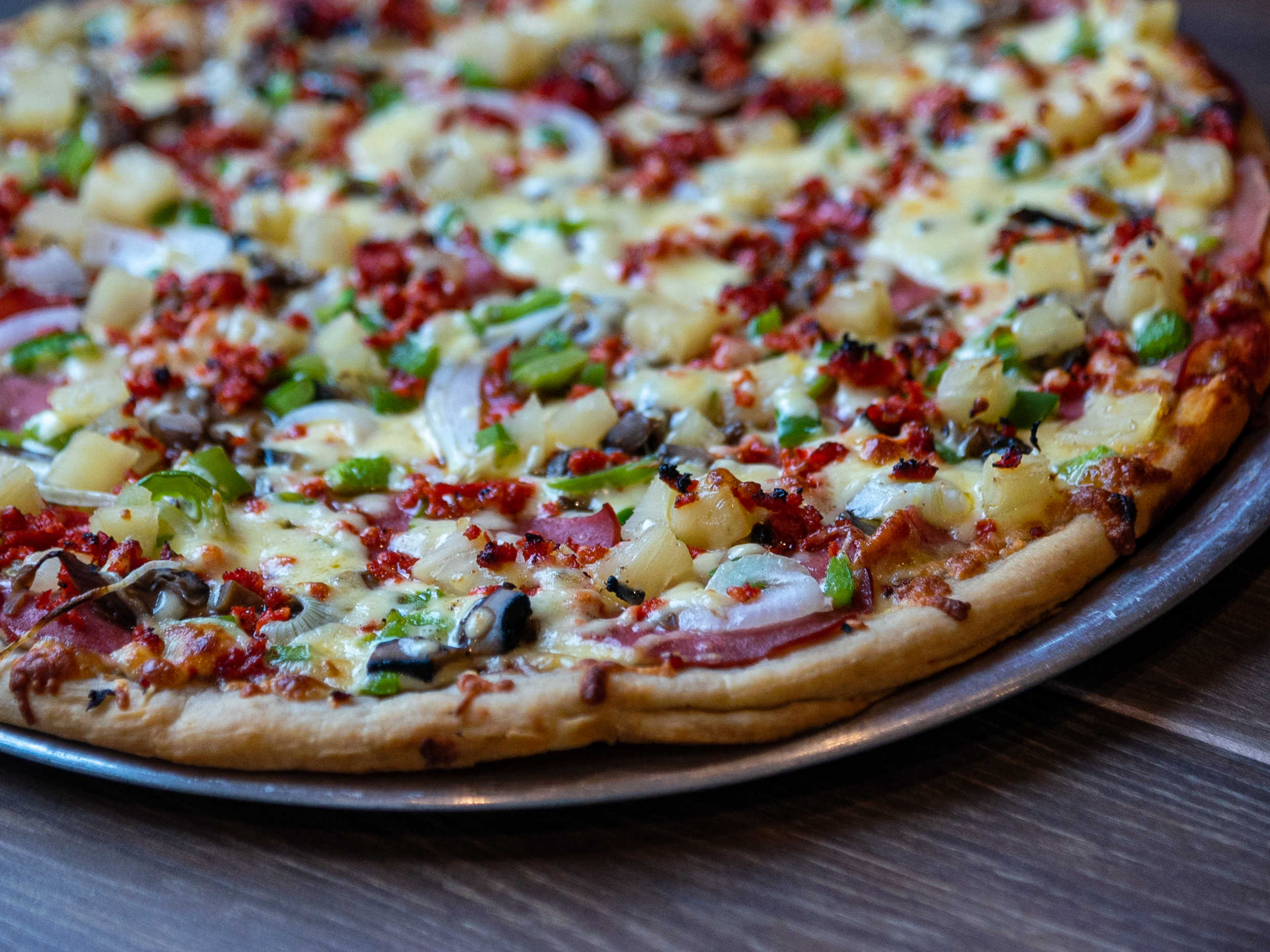 Pizza grande con queso carne al pastor, piña, cebolla y cilantro.