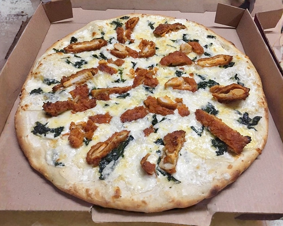 Pizza grande crema de 4 quesos, espinacas y pollo cryspi.
