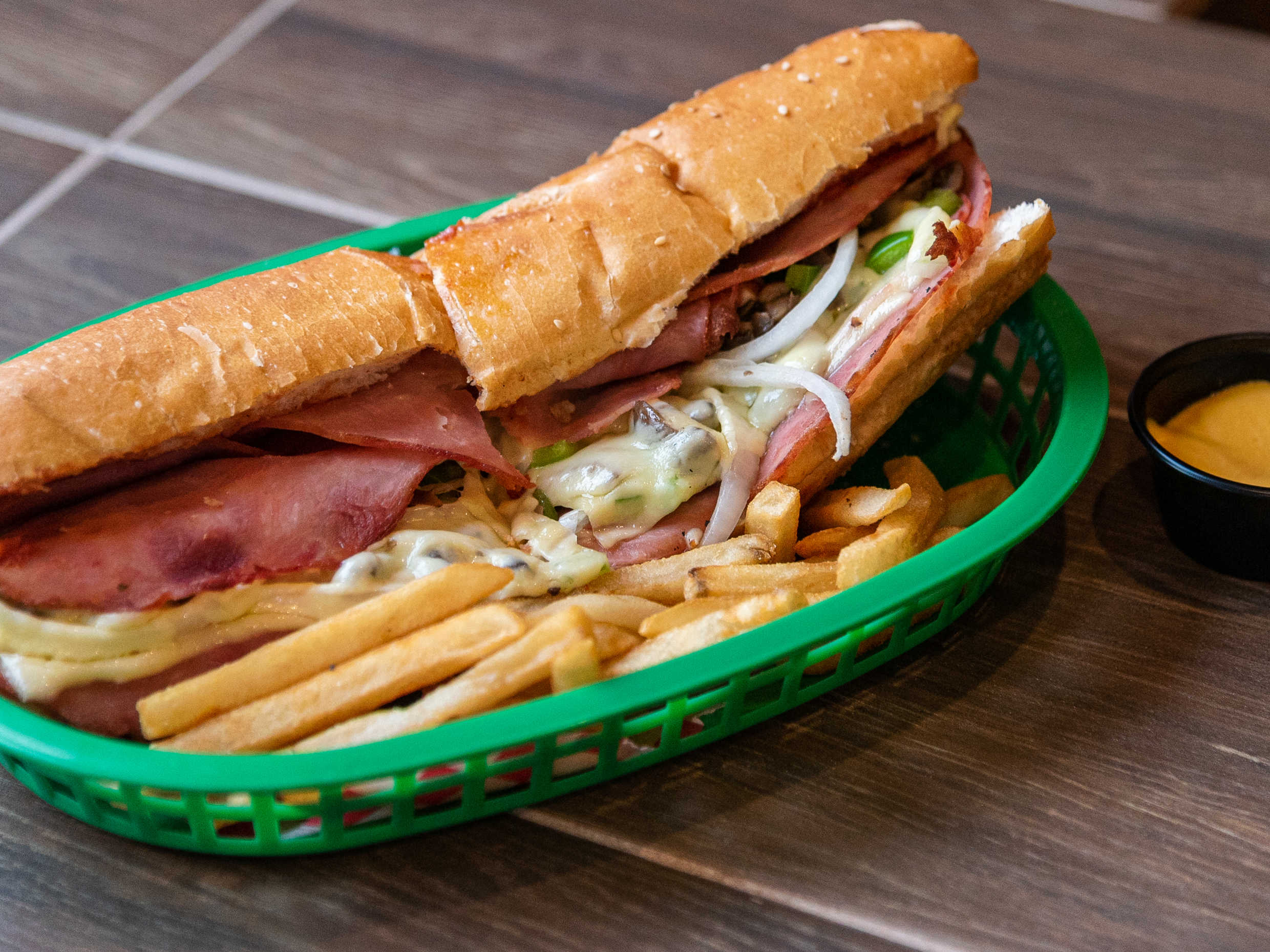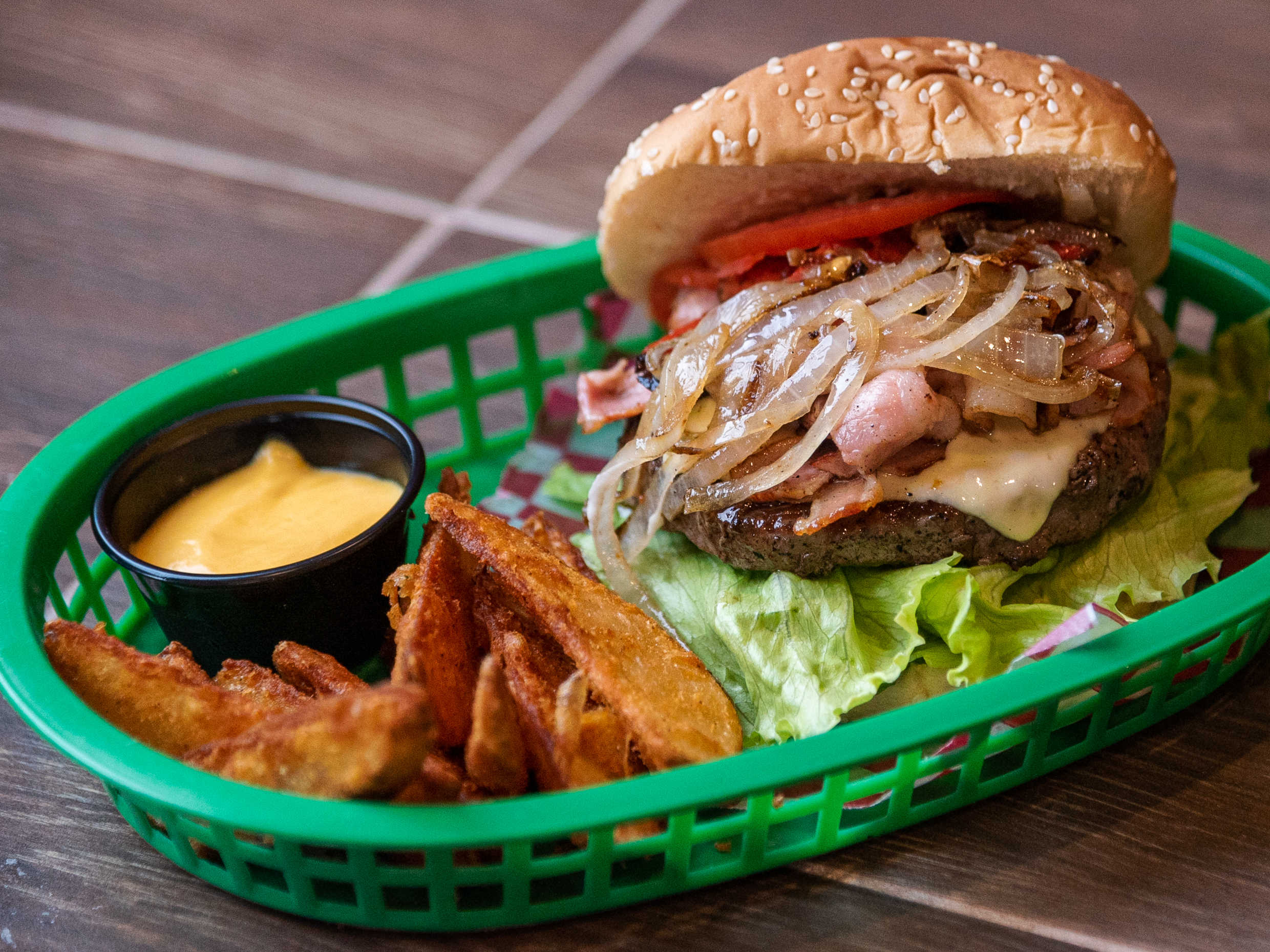 Carne de sirloin, pan tradicional, pepinillo, tomate, cebolla, lechuga fresca y queso.