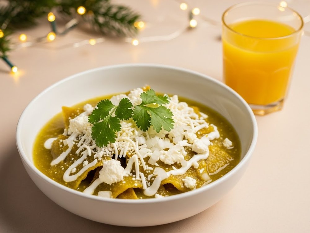 Combo que Incluye Chilaquiles verdes (con crema, cebolla y queso) y 1 jugo de naranja.