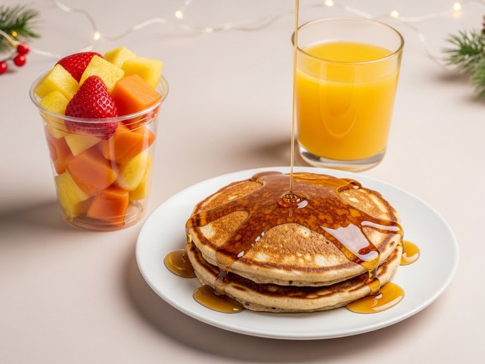 Combo que Incluye unos Pancakes de Avena, una porción de fruta y un jugo de naranja.