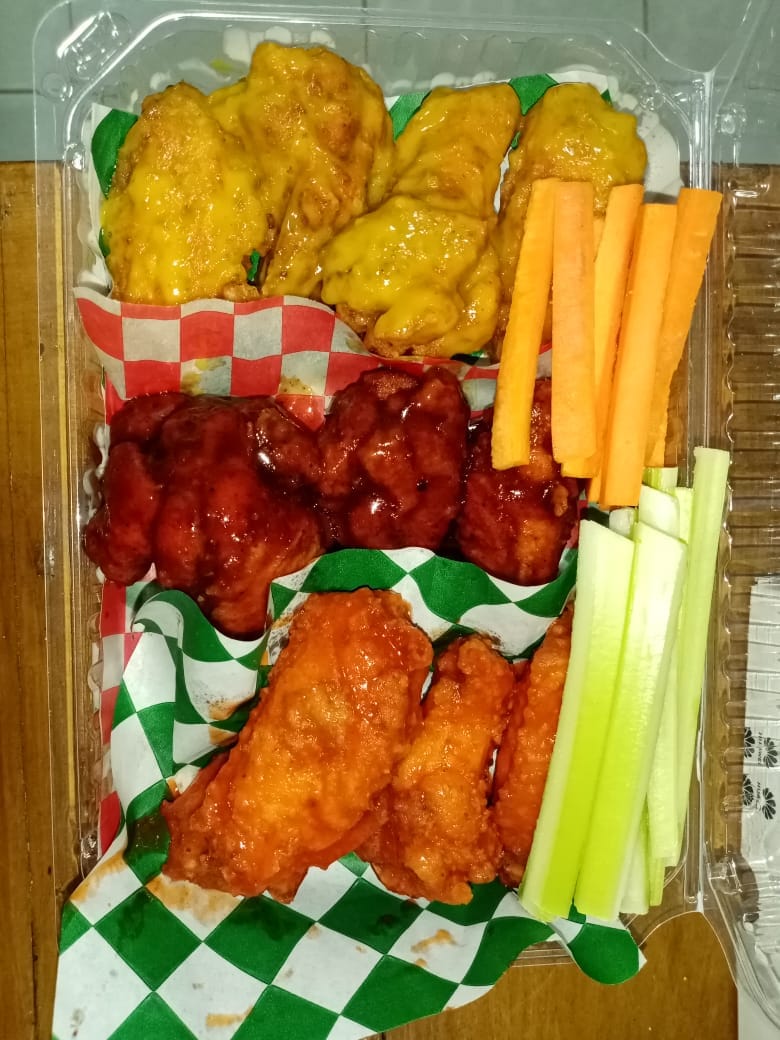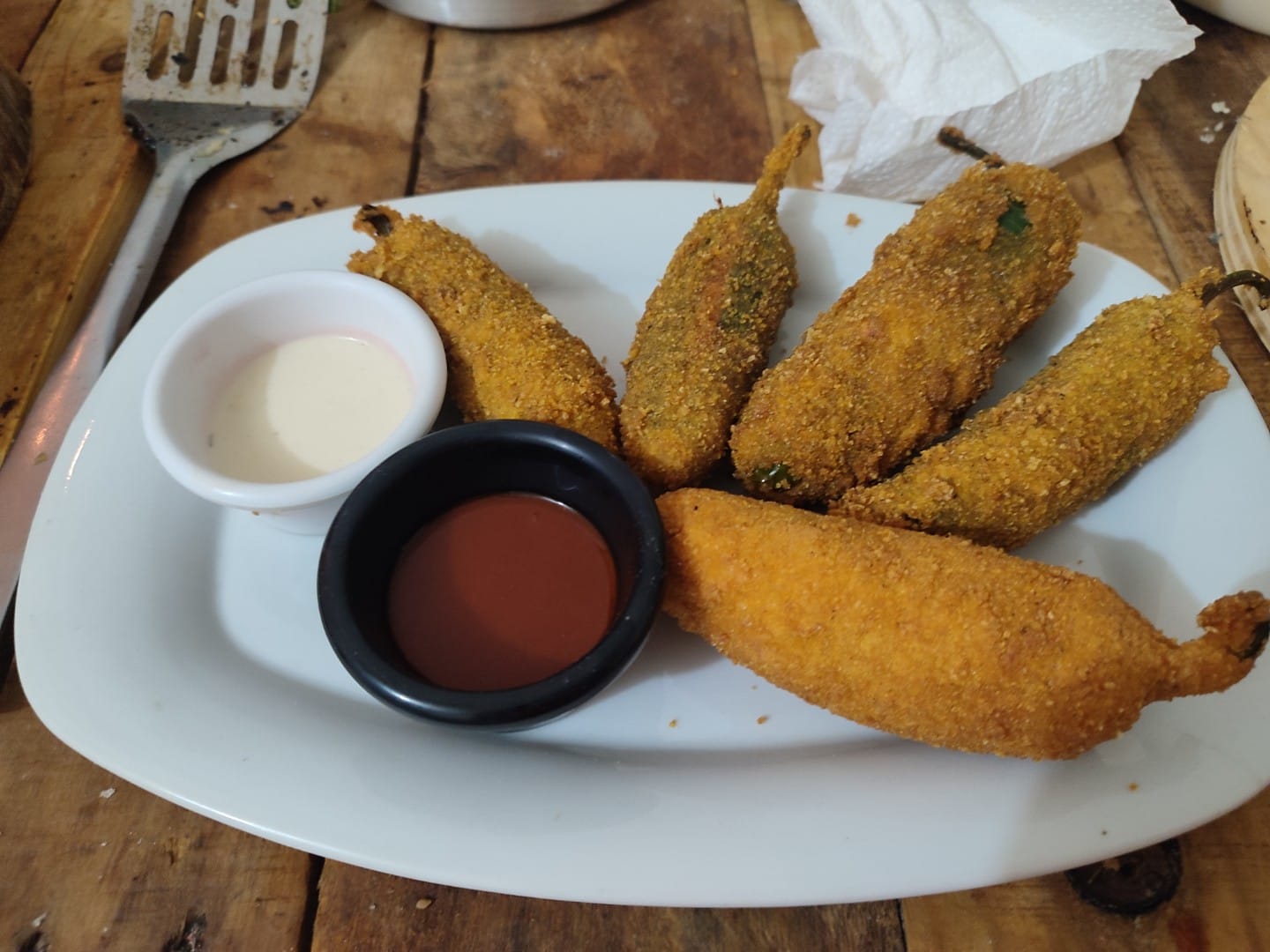 6 Boneles, 6 alitas, 5 d2 de queso, 3 jalapeños poppers, 5 aros de cebolla.
