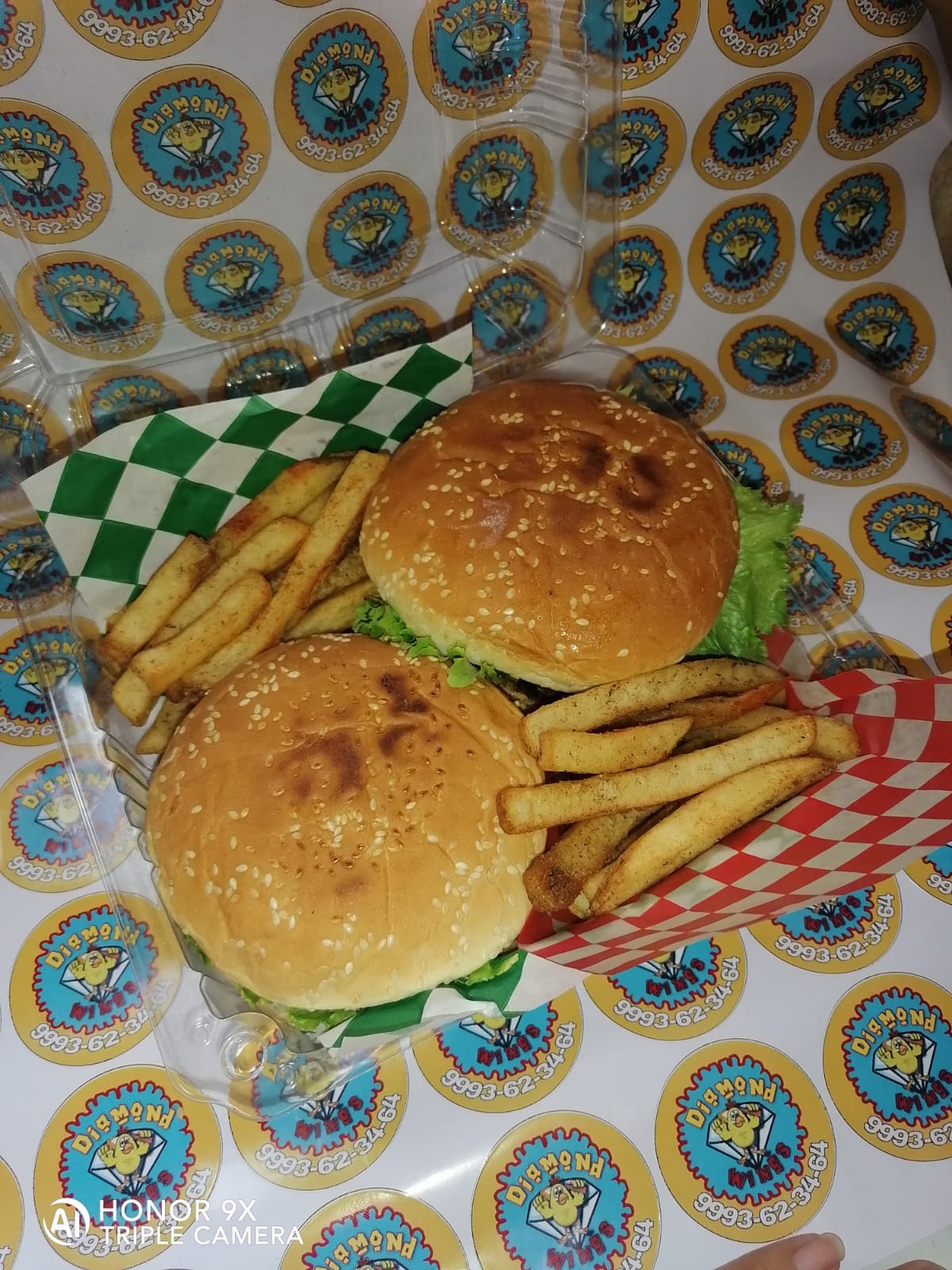 3 Hamburguesas de la casa, 3 hot dog sencillos, 3 d2 de queso y orden de papás a la francesa.