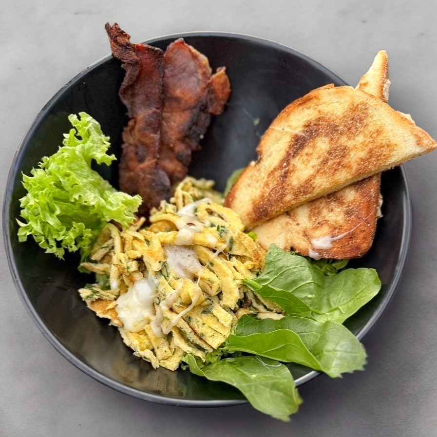 Huevos revueltos, espinaca, tocino, queso mozzarella acompañados de pan con ajo.