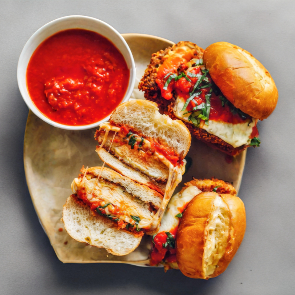 Pan brioche artesanal, pollo empanizado cubierto de mozzarella y parmesano, con espinacas y salsa marinara, acompañado de papas a la francesa.