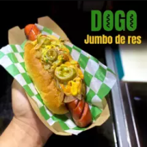 1 Dogo jumbo de res con complementos y aderezos a tu gusto + Agua del día + 125 gr de Papas a la francesa