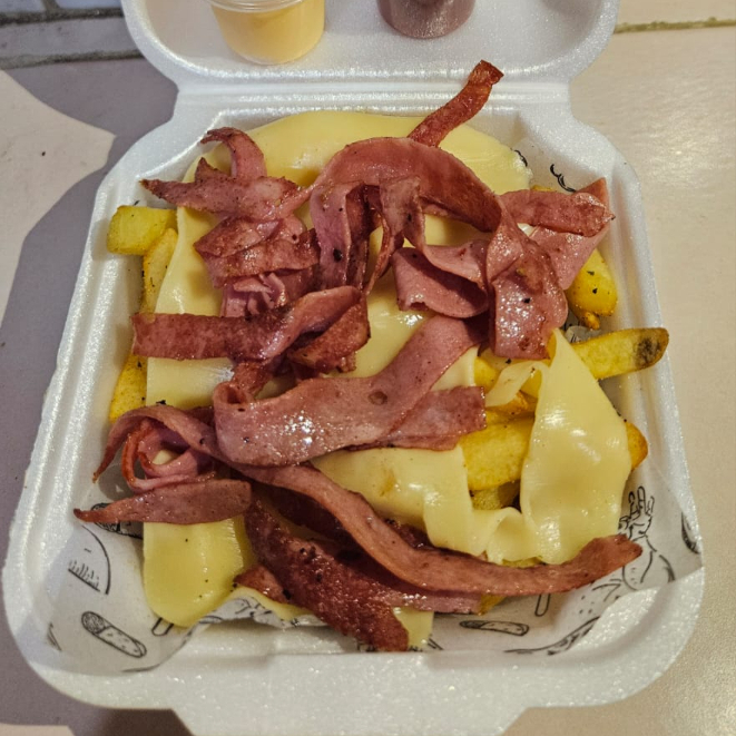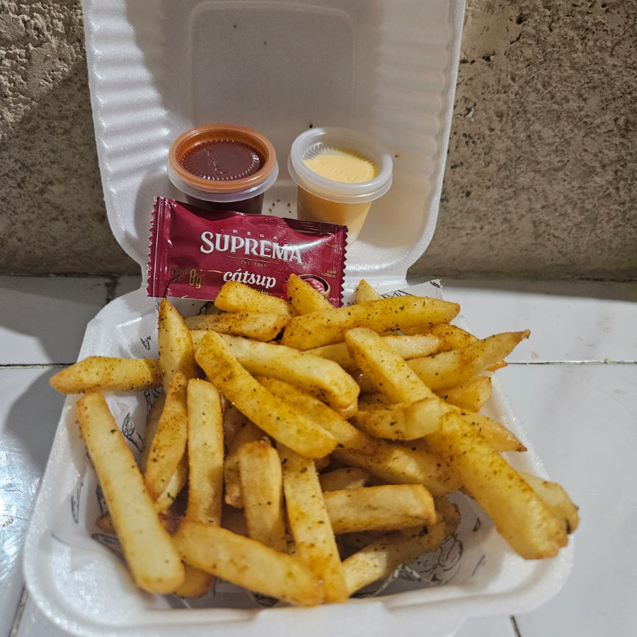 Papa a la francesa en forma de palillos fritos con queso manchego gratinado y tocino, incluye catsup, queso cheddar y salsa picante.