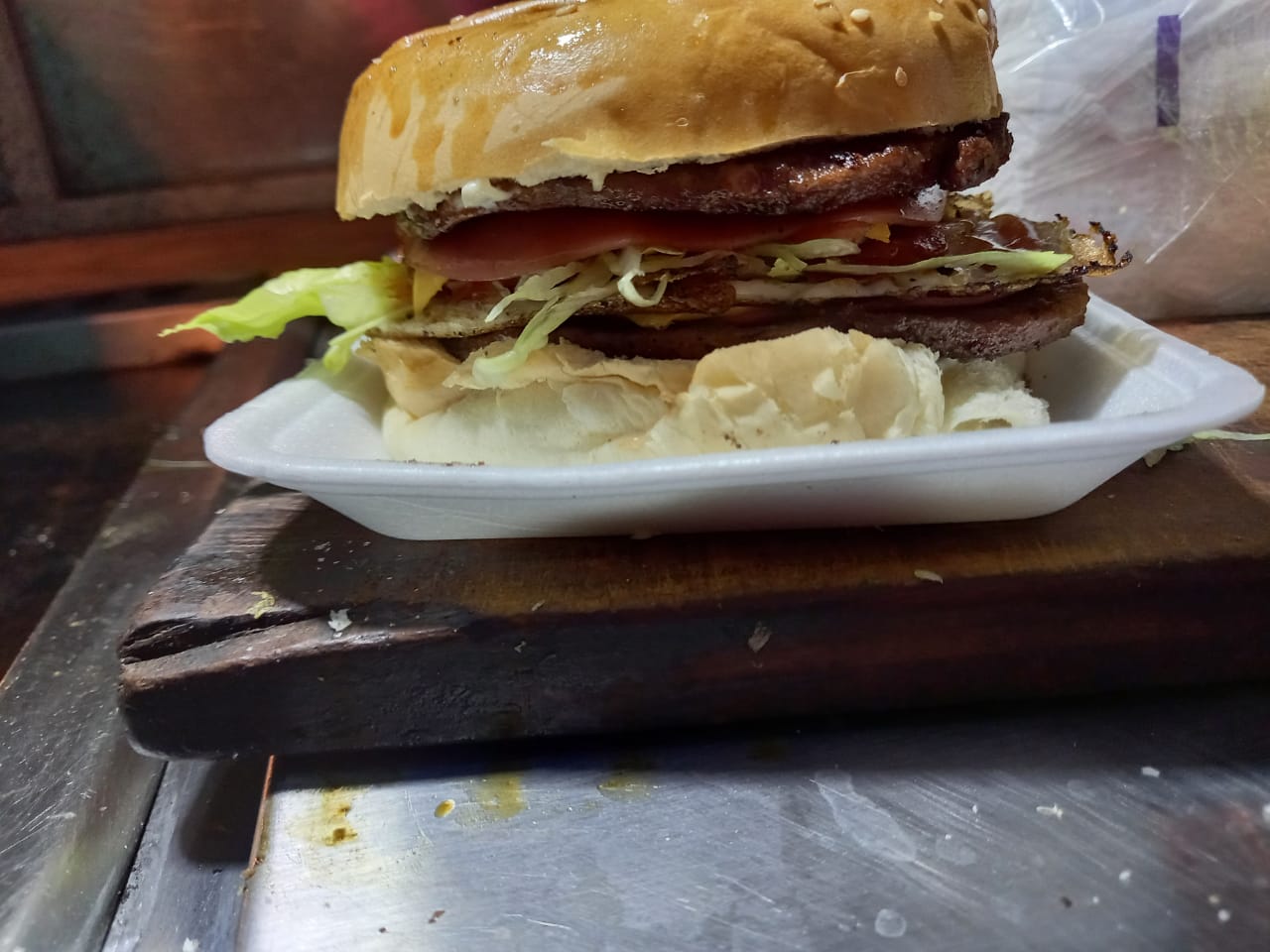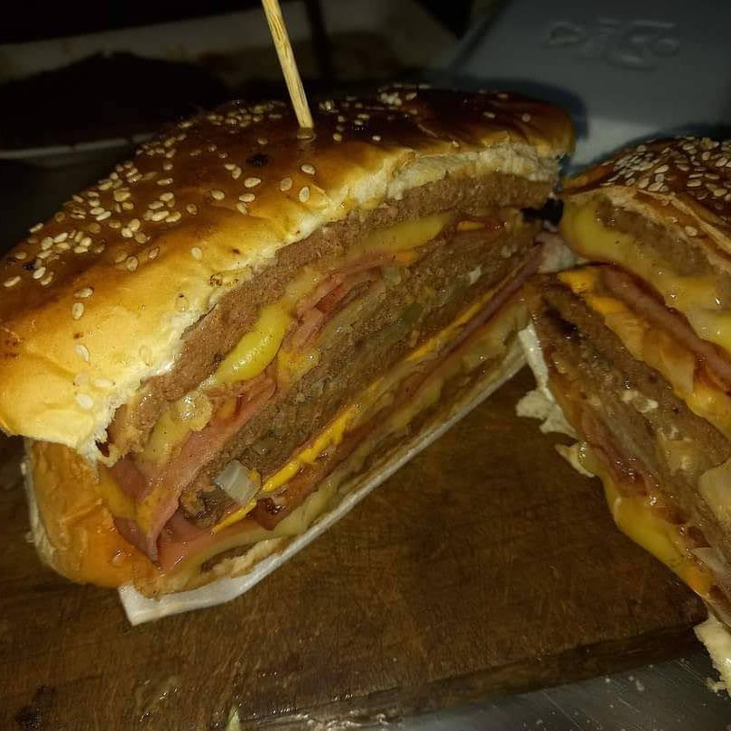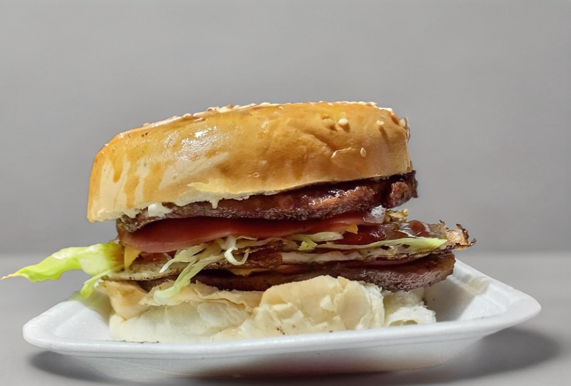 Pan artesanal, dos rebanada de carnes 100% proteína, dos rebanadas de jamón, huevo, tocino, cebolla, lechuga romana, cátsup.