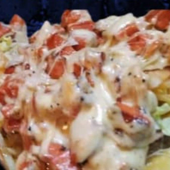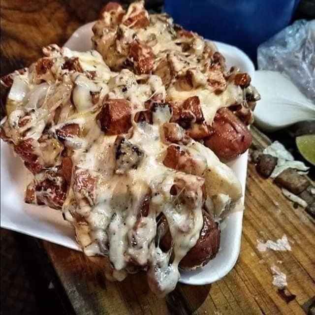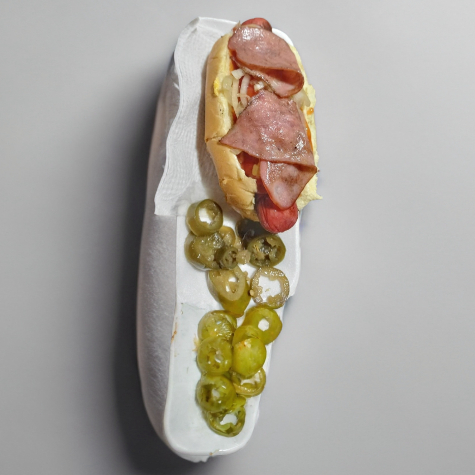 Pan artesanal, salchicha de pavo. acompañada de tocino, chorizo, jamón, queso tipo americano, mayonesa,Manchego, cebolla, cátsup y picante.