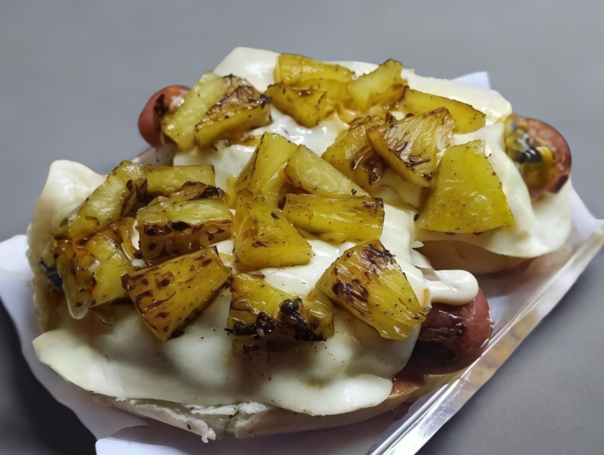 Pan, salchicha de pavo, jamón,queso americano, mayonesa, cebolla, cátsup, picante, queso manchego y piña en la parte final.
