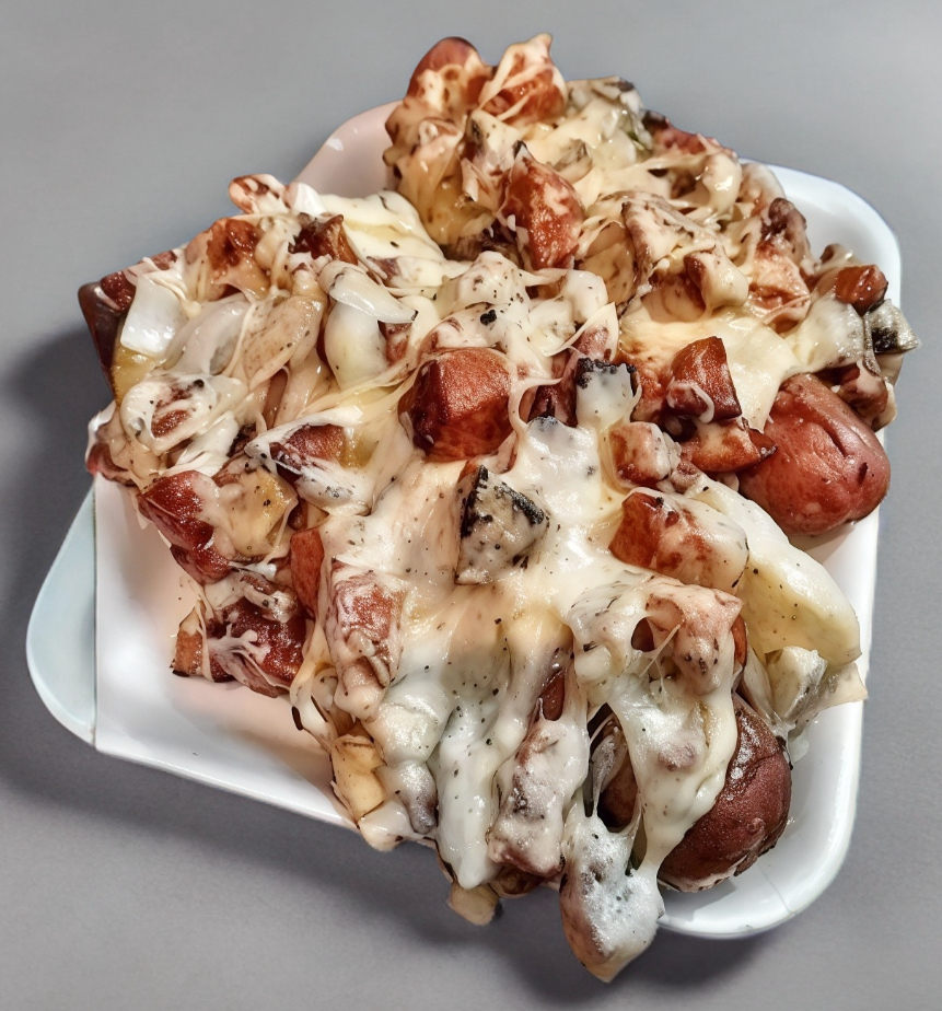 Pan, salchicha premium, jamón y queso Americano, cebolla, Manchego, champiñon, y tocino