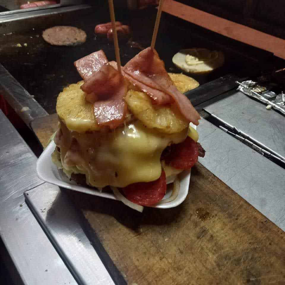 Pan artesanal, doble carne, huevo, chorizo y tocino, cebolla, lechuga romana, cátsup., piña, chorizo ranchero