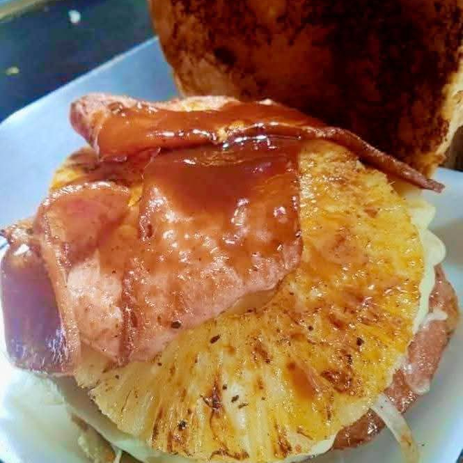 Pan artesanal, mayonesa, carne 100% proteína, jamón y queso tipo americano, cebolla, lechuga romana, cátsup, con queso manchego, piña, y tocino.