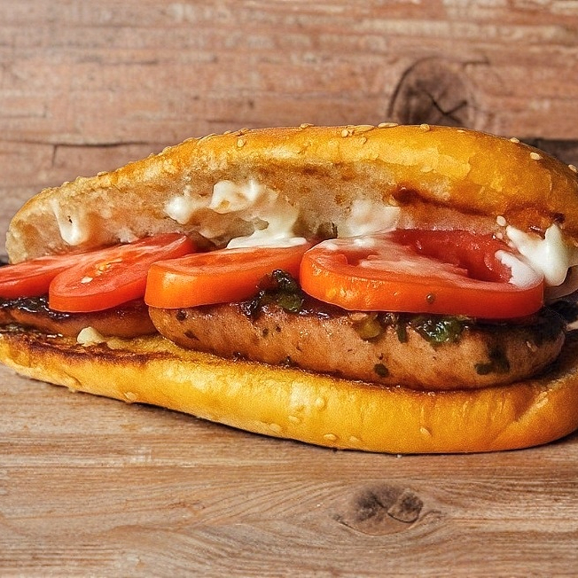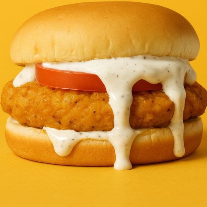 Pan suave, pollo tempura, tomate y ranch dogzilla.