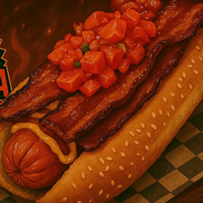 Tocino, Salchicha de Res Premium, Pan Suave, tomate, Catsup, Mostaza, Mayonesa y cebolla caramelizada.
