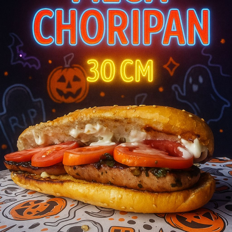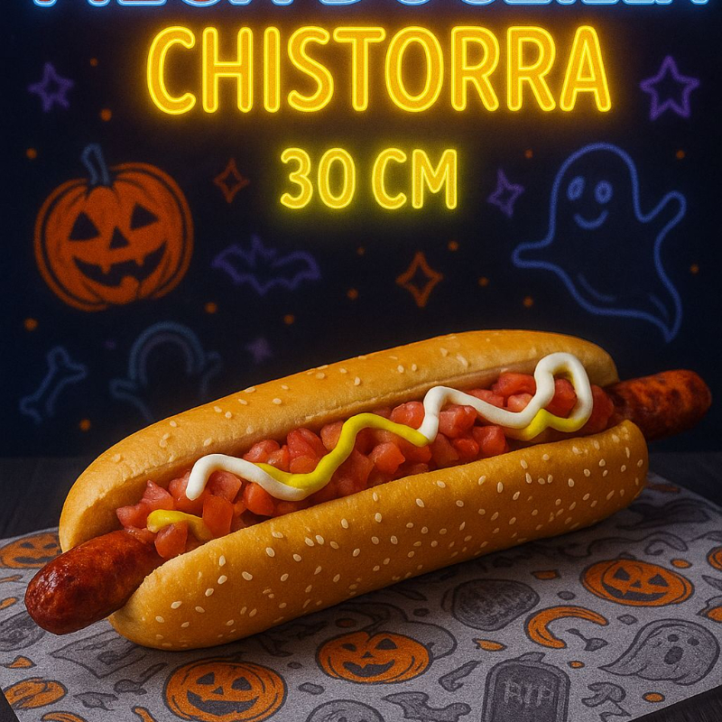 Pan jumbo, Chistorra de 30cm, tomate, cebolla caramelizada, mayonesa, catsup y mostaza.