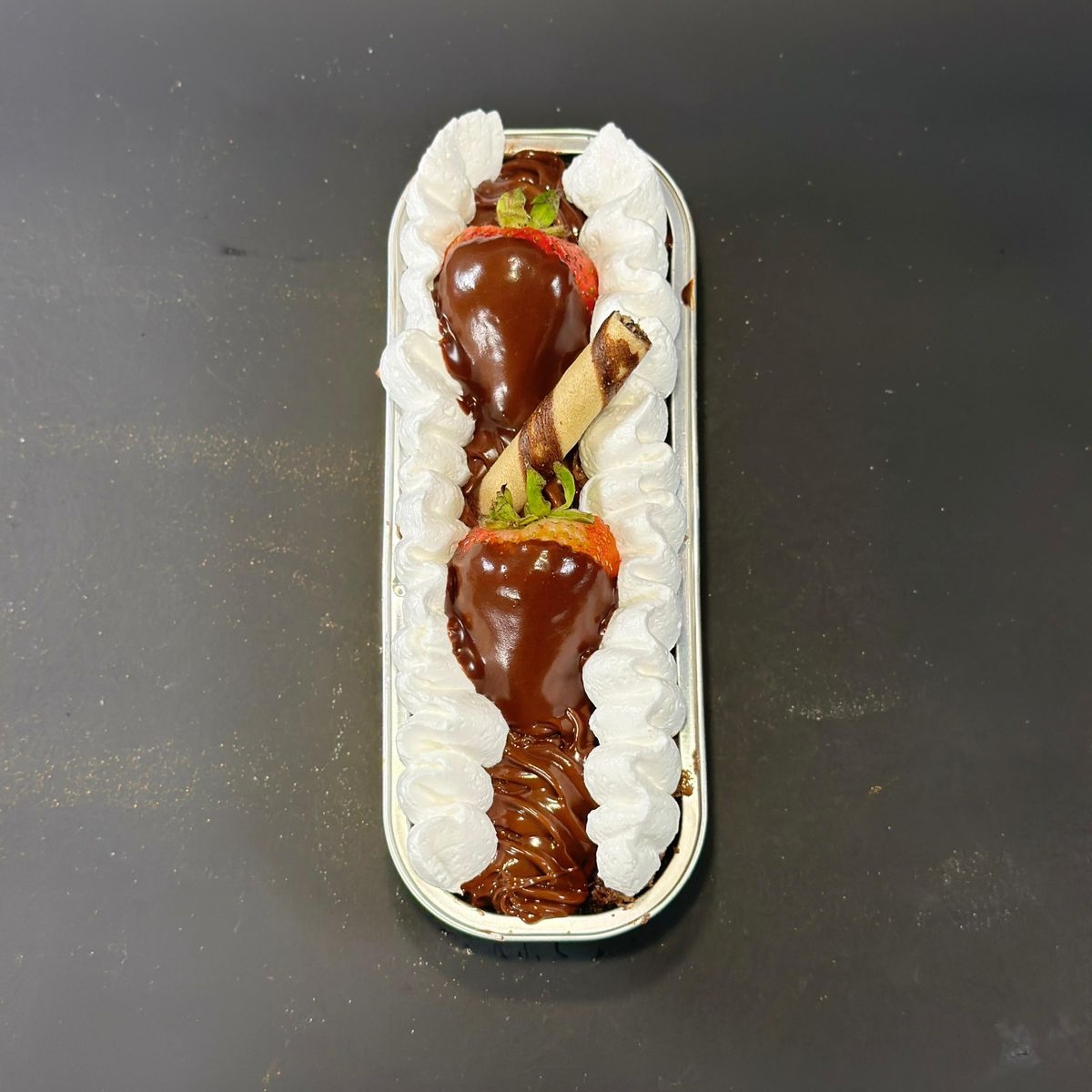 Pan de chocolate, nutella, tres leches, crocante de chocolate, crema batida y fresas.