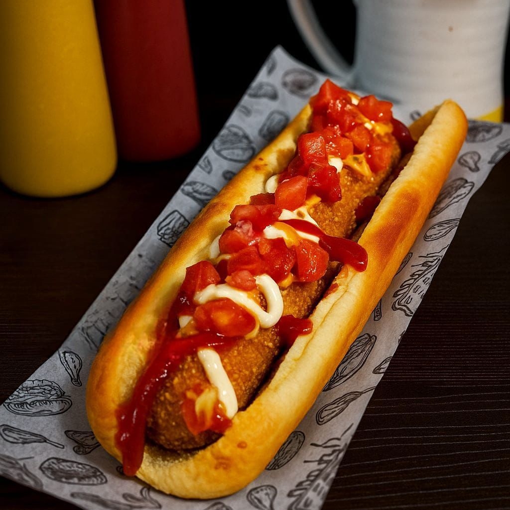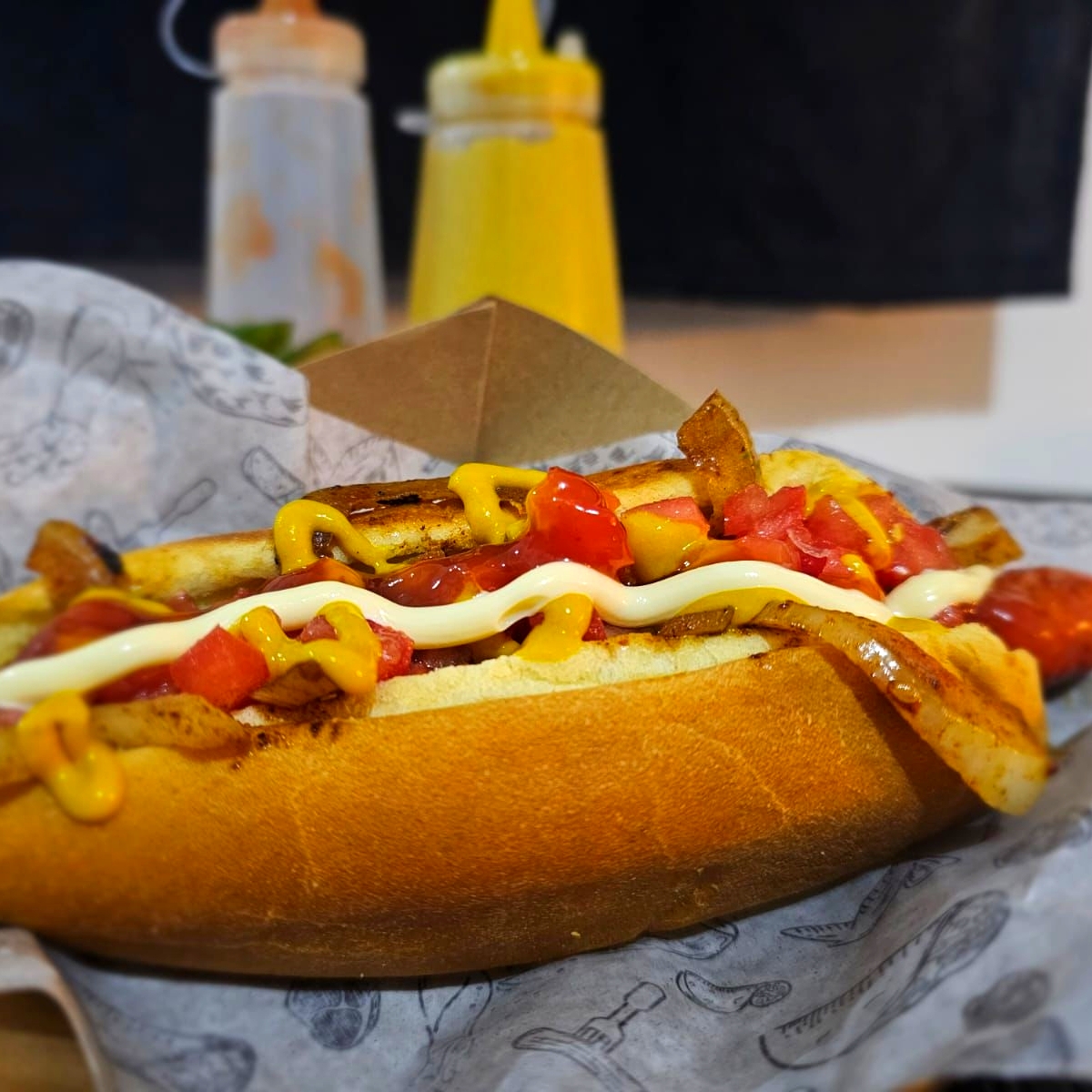 Estilo gourmet con chistorra artesanal, Pan Suave, Cebolla Caramelizada, Tomate, Mayonesa, Mostaza y Catsup.