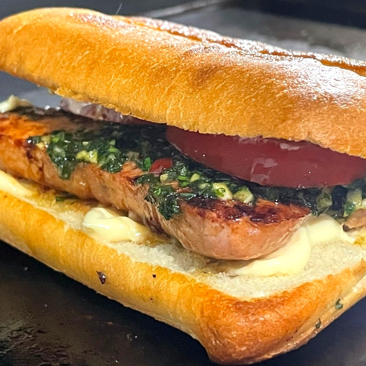 Pan chapata, chorizo argentino, chimichurri, mayonesa y tomate.