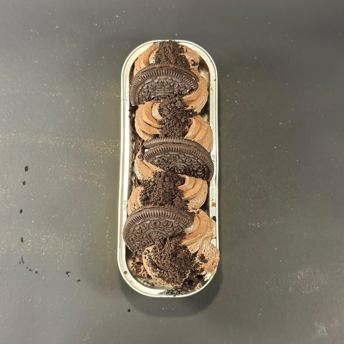 Pan de chocolate, tres leches, crocante de chocolate, crema batida y oreos.