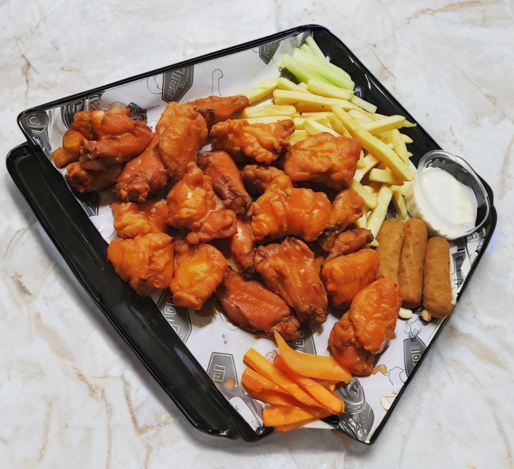 6 alitas, 6 boneless, 2 tiras crispy, 2 dedos de queso y papas a la francesa