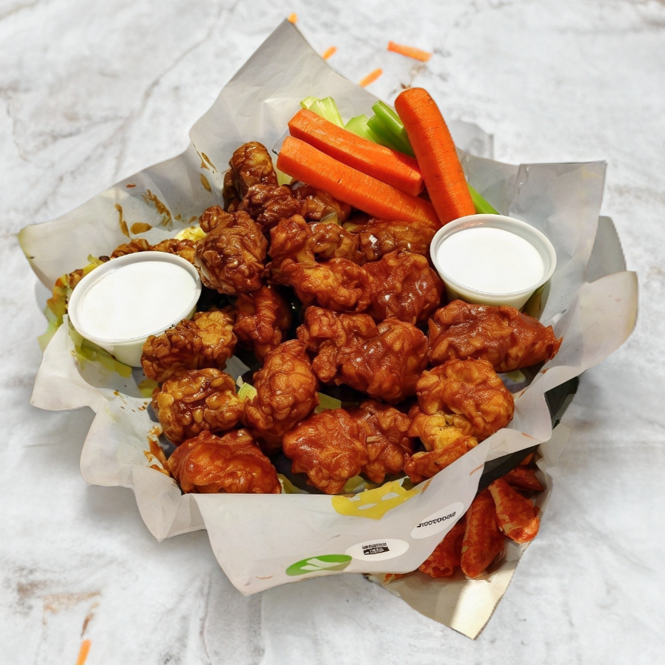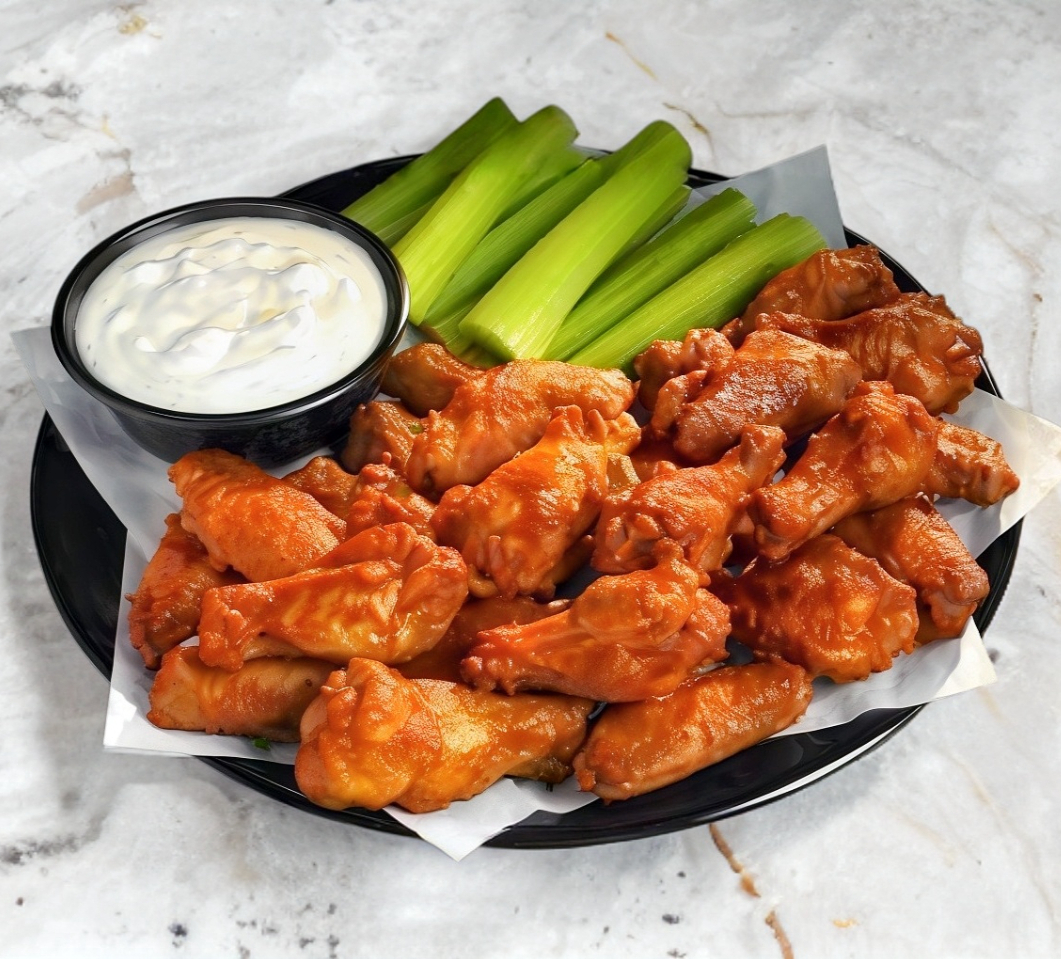 alitas bañadas con 2 salsas a escoger acompañadas con zanahoria y apio