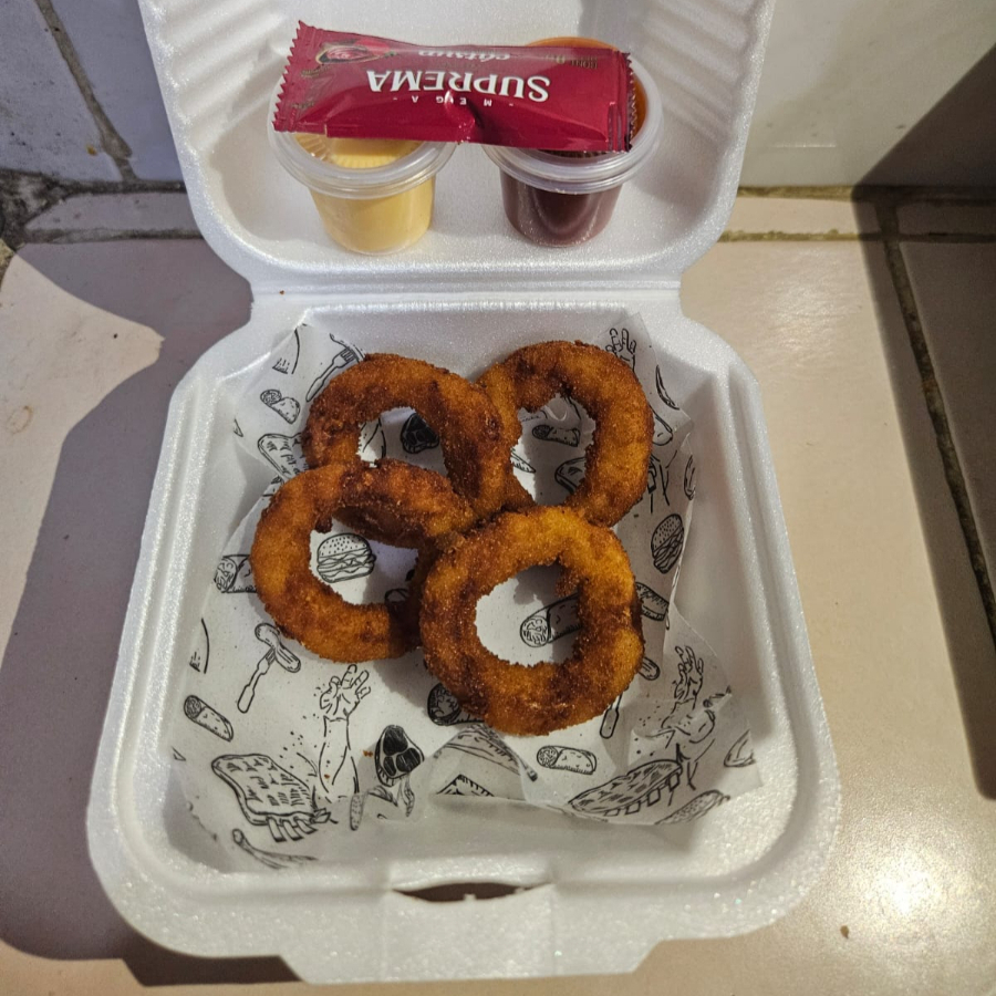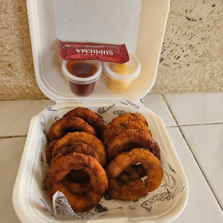 Ricos aros de cebolla empanizadas y crujientes. Acompañadas de cátsup y salsa picante.