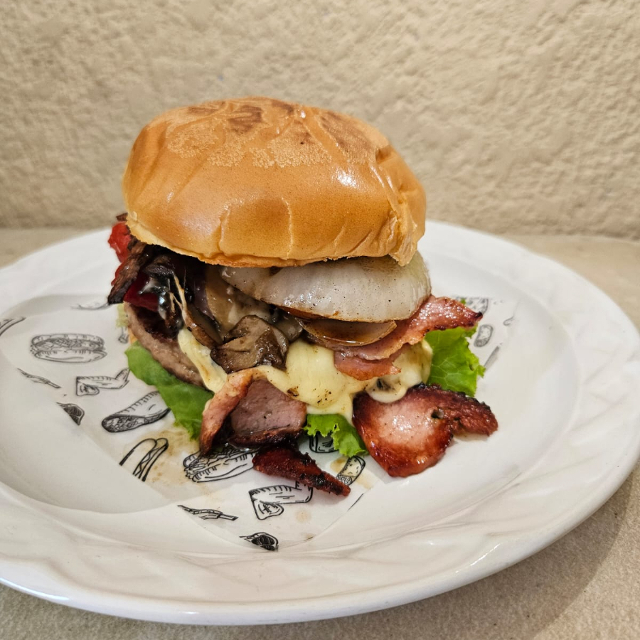Hamburguesa champiñón, triple carne(150 gm c/u) y triple queso, pan brioche, lechuga italiana, tomate, cebolla, jamón cocido y aderezos (cátsup,mayonesa,mostaza) todo viene en sobres y jalapeños.