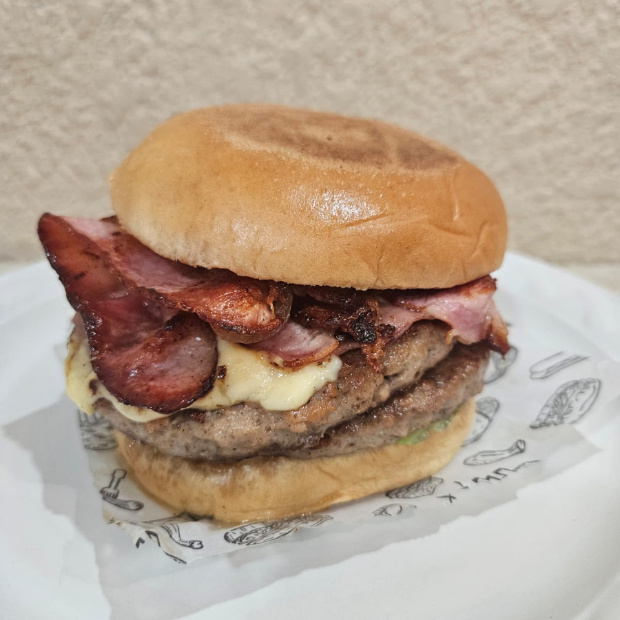 Hamburguesa tocino crujiente triple carne (150g c/u) y triple queso, pan brioche, lechuga italiana, tomate, cebolla, jamón cocido y aderezos (cátsup,mayonesa,mostaza) todo viene en sobres y jalapeños.