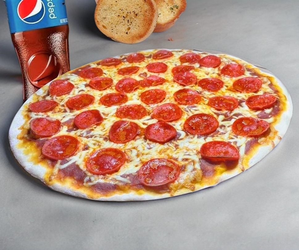 Pizza Grande 12 rebanadas. DOBLE PEPPERONI. Incluye Refresco de 1.5L y Panecitos con ajo.