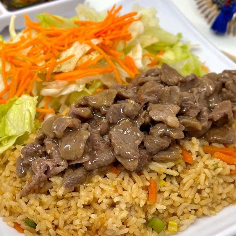 De puerco o pollo arroz frito, japonés con topping de carne.