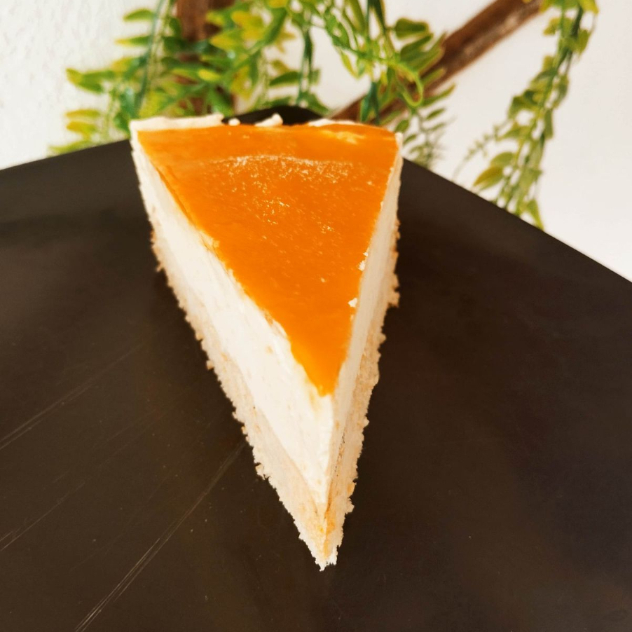 Pieza de pastel de pudin de maracuya y vainilla relleno sobre una deliciosa masa quebrada y crumble