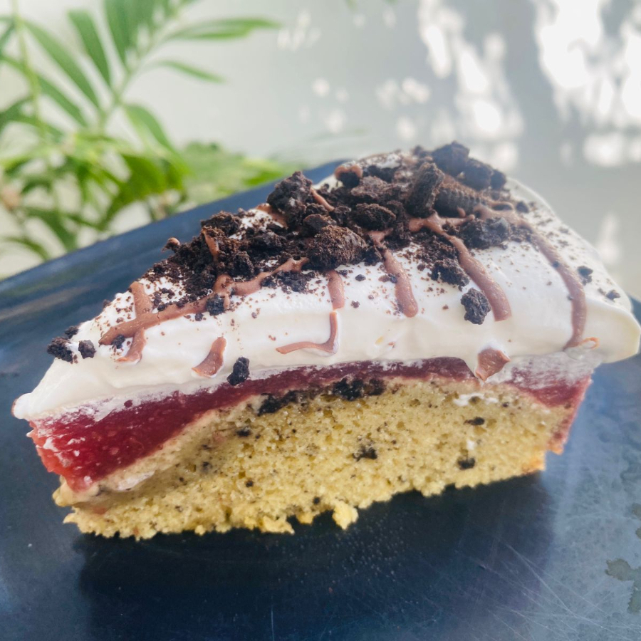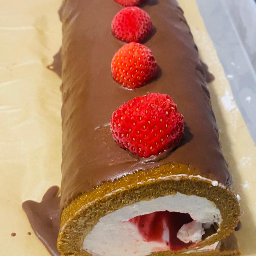 Rollo de chocolate con queso crema cubierto con fresas (fruta de temporada).