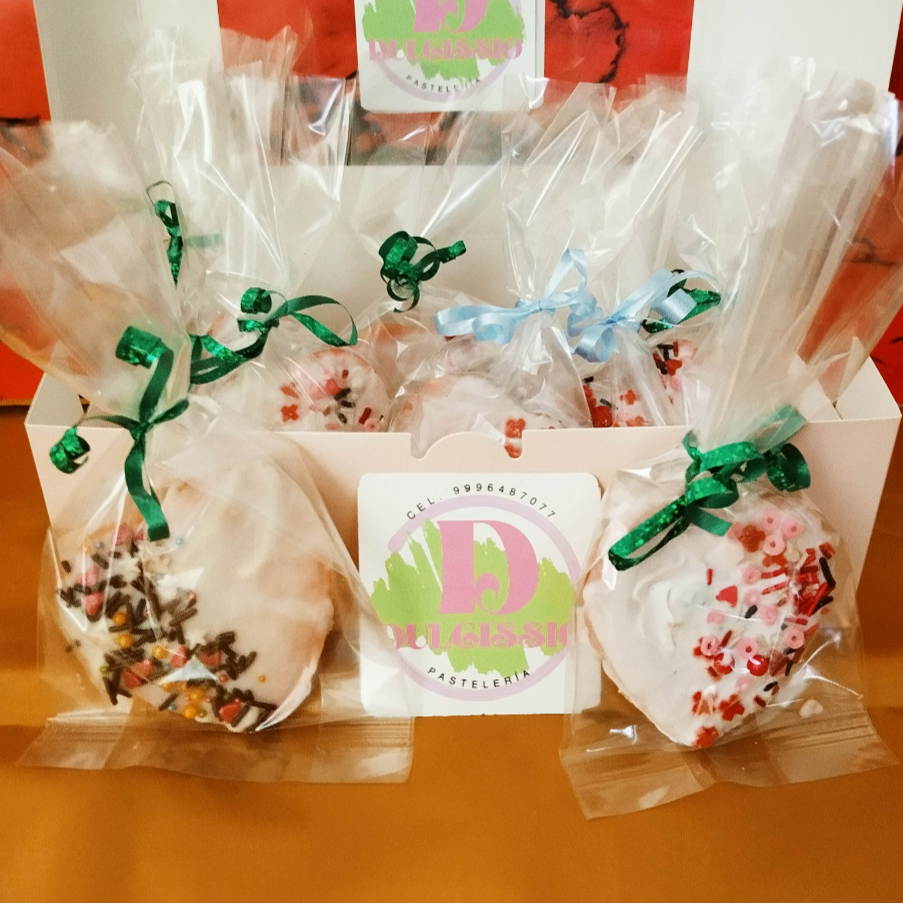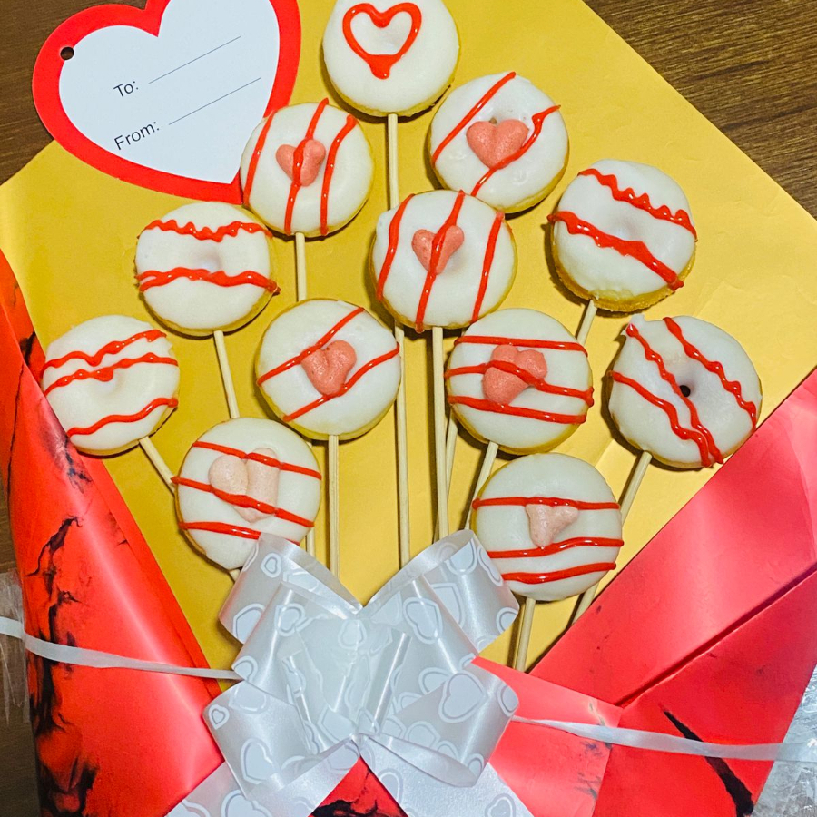 12 Mini Donas hechas con sabor fresa y decoradas con chocolate Blanco.