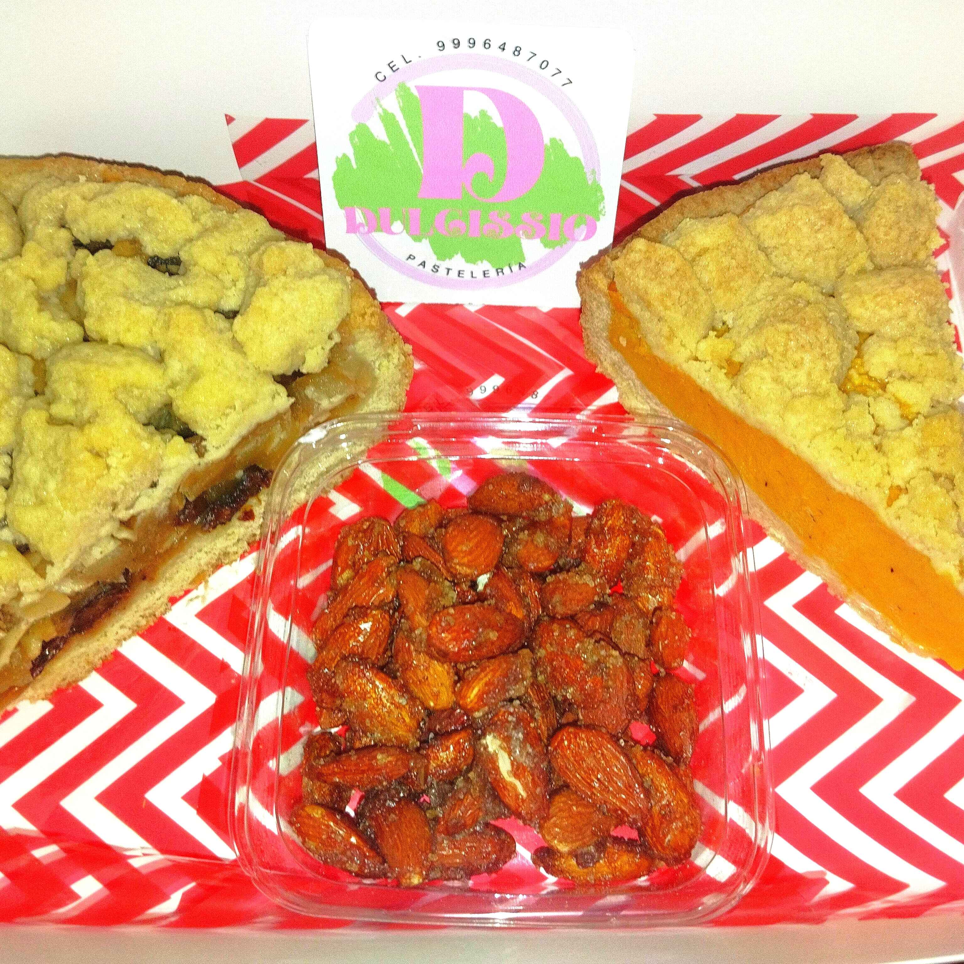 PASTEL CRUMBLE DE MANZANA*1 + PASTEL CRUMBLE CON PUDIN DE MARACUYA*1 + ALMENDRAS TOSTADAS CON ESPECIES*1