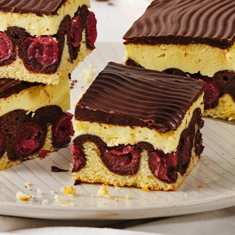 Pieza de pastel con pan de vainilla, capa de cacao con cerezas, flan de vainilla y cobertura de chocolate