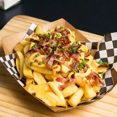 250 gr de papas a la francesa acompañadas con tocino y queso gratinado