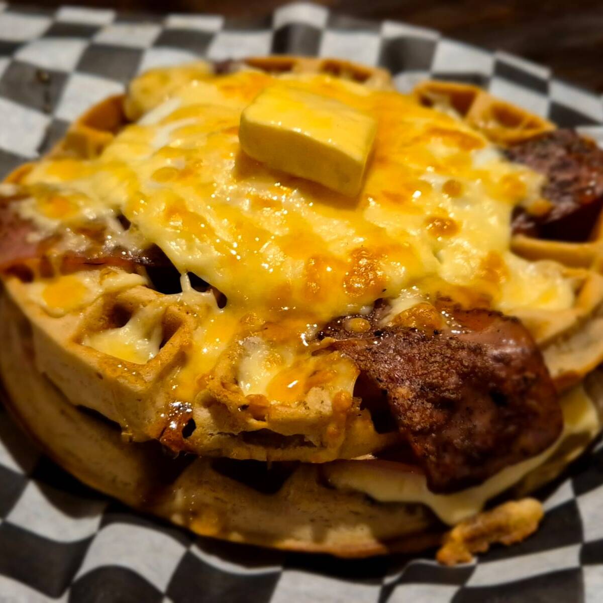waffle sandwich de jamon ahumado, queso manchego, coronado con tocino y huevo estrellado