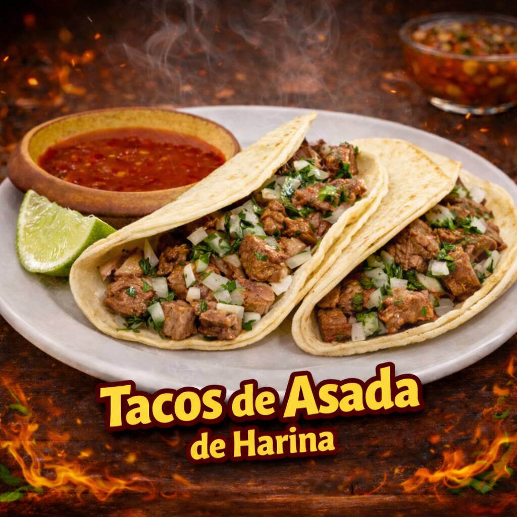 🌮Ricos tacos de harina preparados con jugosa carne asada o de pastor acompañados de limón, cebolla y salsas de la casa.
