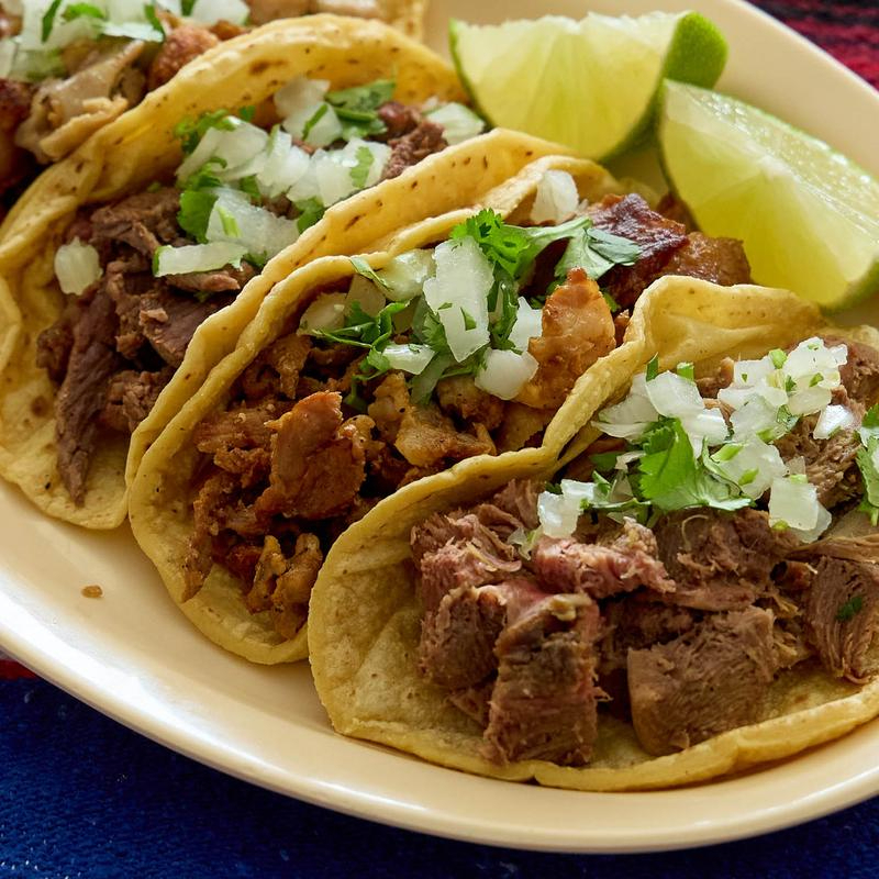 🌮Ricos tacos preparados de maíz con jugosa carne asada o de pastor acompañados de limón, cebolla y salsas de la casa.