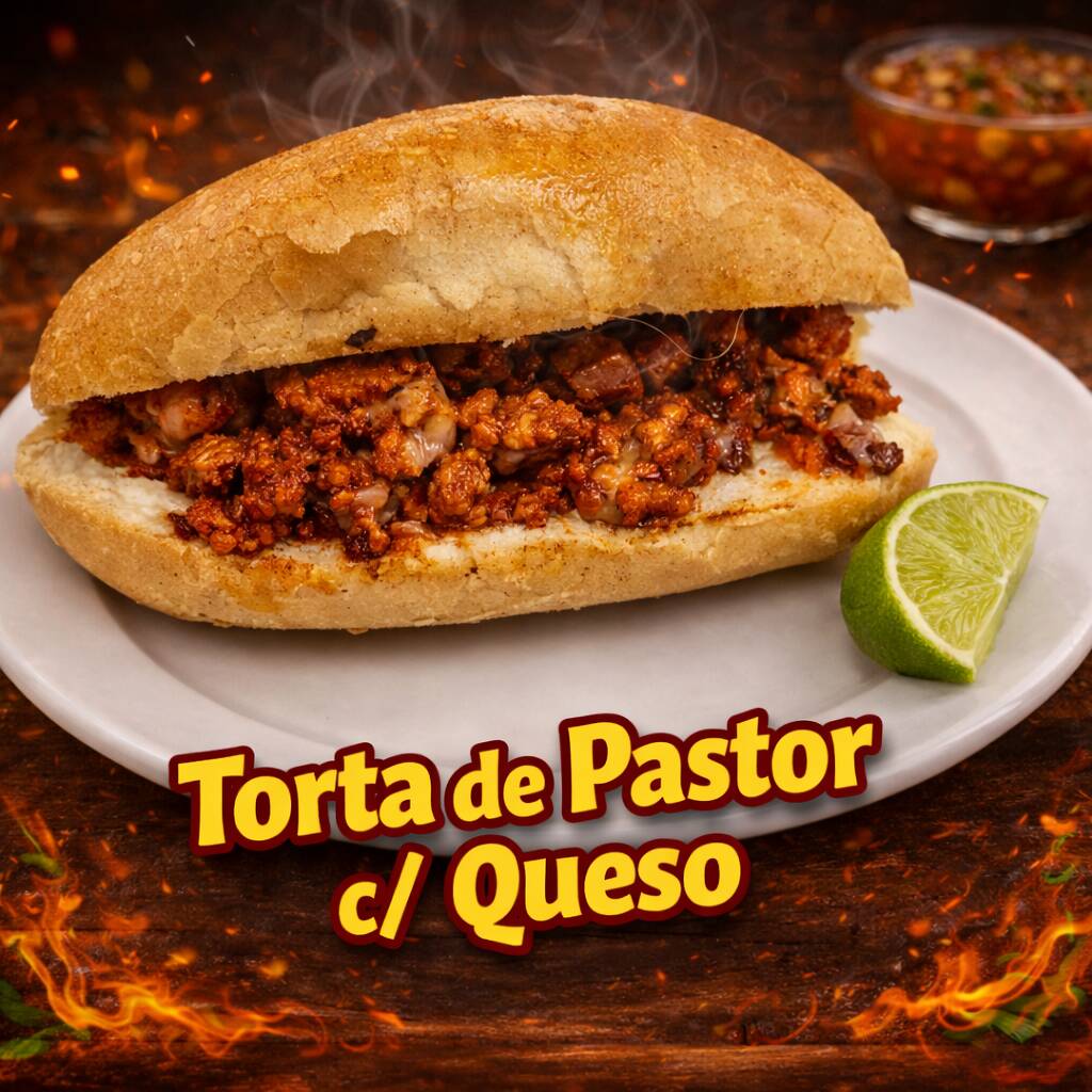 🥖Deliciosa torta al pastor con queso acompañada de limón, cebolla y salsas de la casa