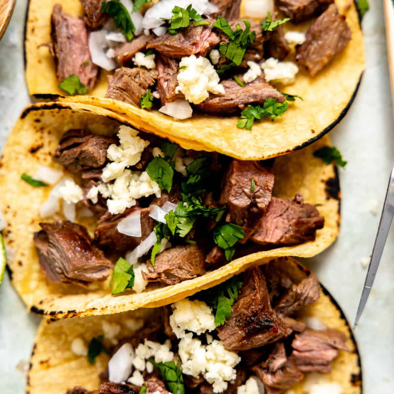 🌮Ricos tacos de harina con queso preparados con jugosa carne asada o de pastor acompañados de limón, cebolla y salsas de la casa.