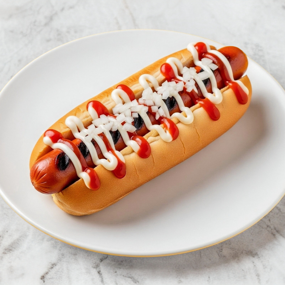 Delicioso hot dog con pan de dia salchicha de pavo, capsu mayonesa y cebolla jamon y queso americano