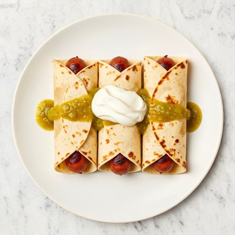 Deliciosa orden de tortilla de harina con salchicha de pavo, doradas y cocinadas perfección, acompañado de media crema salsa verde y romanita (orden de 3 piezas)