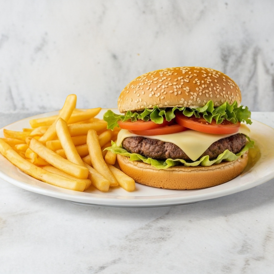 Una jugosa hamburguesa de carne de res mixta 70% res , cocida a la perfección y servida en un pan suave y dorado, acompañado de una porción de (45gr) de papas fritas, espolvoreadas con un toque de sal