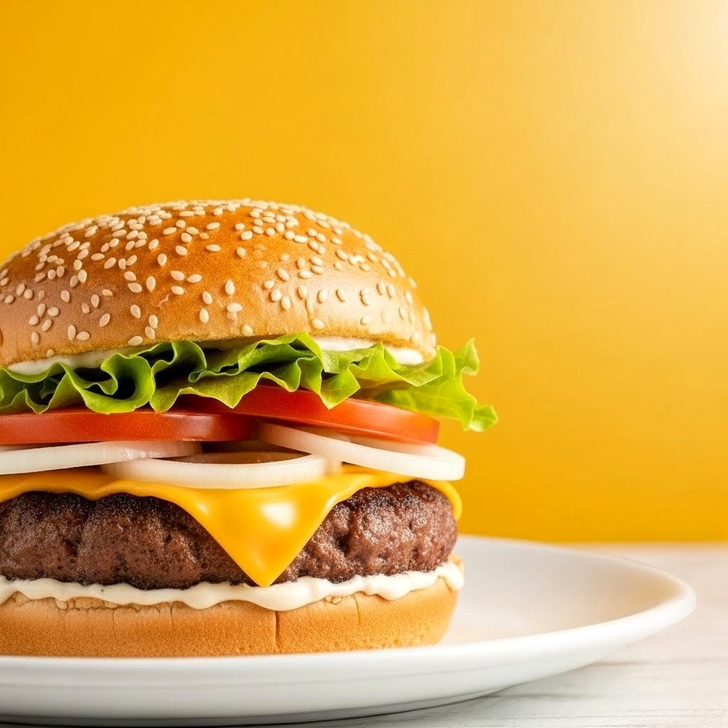 Una jugosa hamburguesa de carne de res 70% mixta, cocida a la perfección y servida en un pan suave y dorado