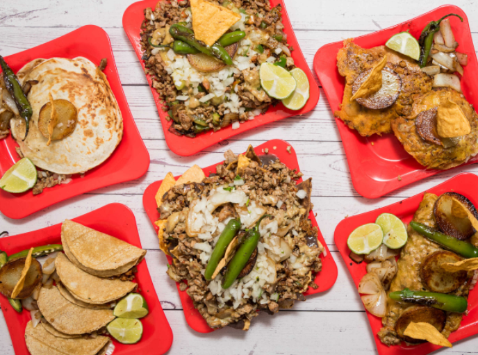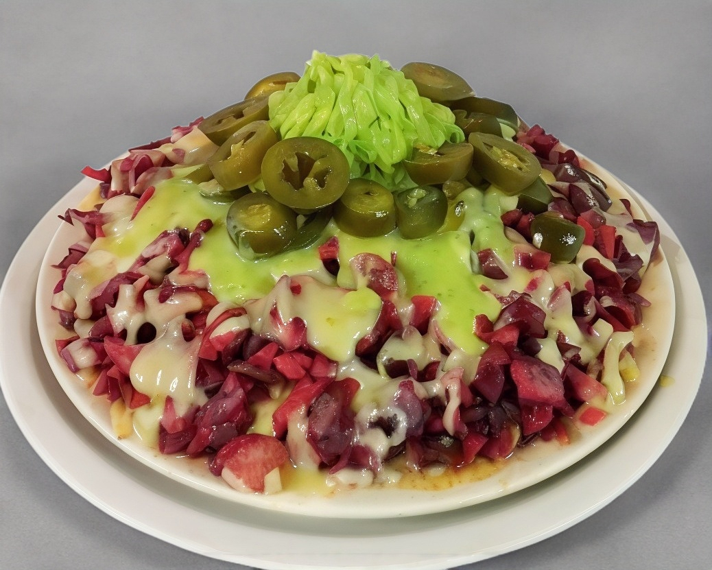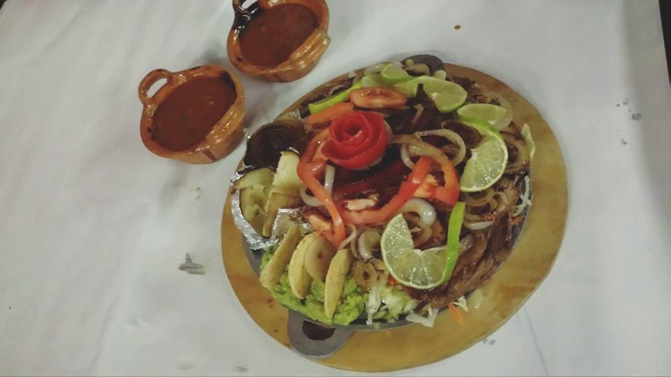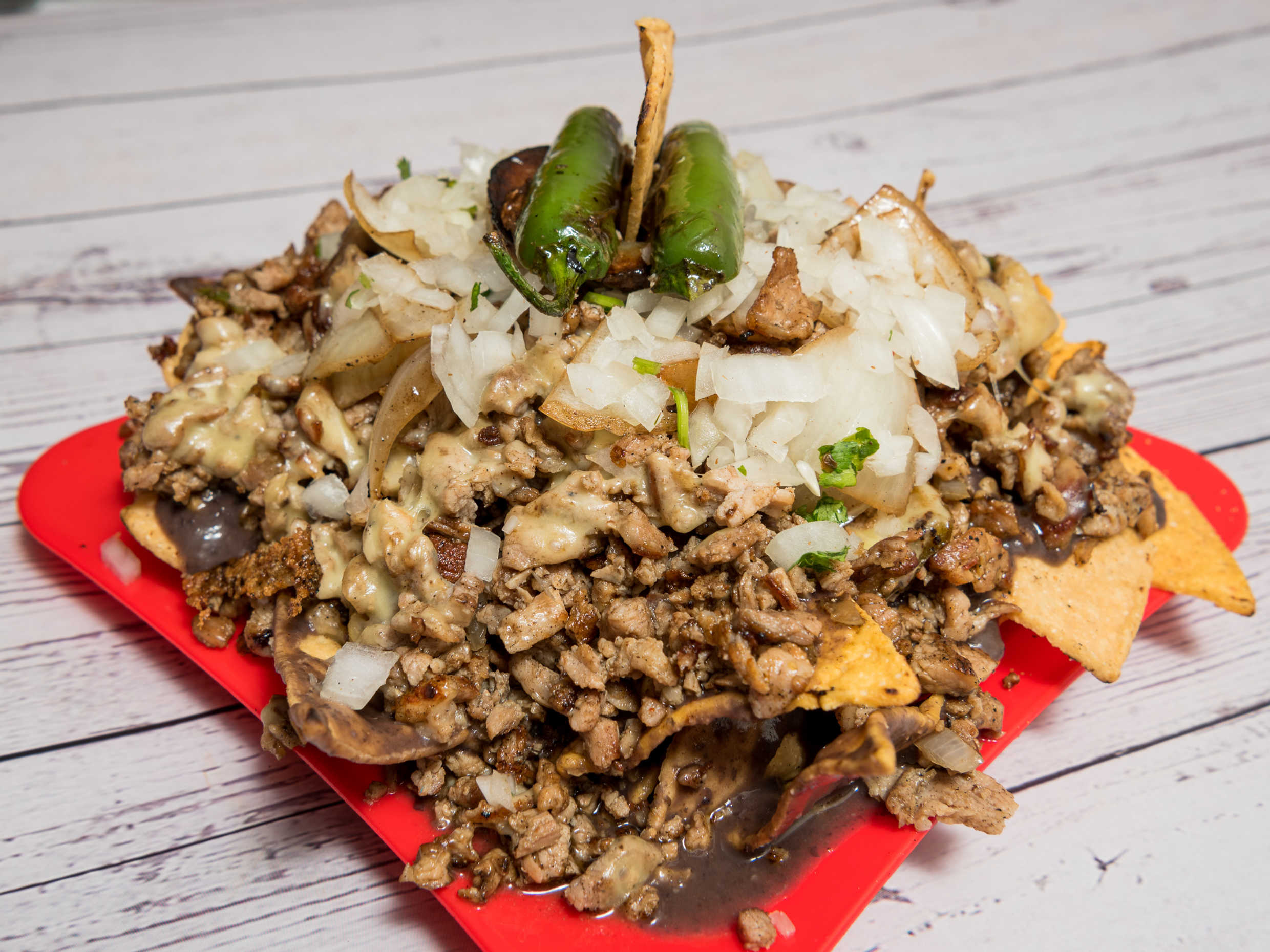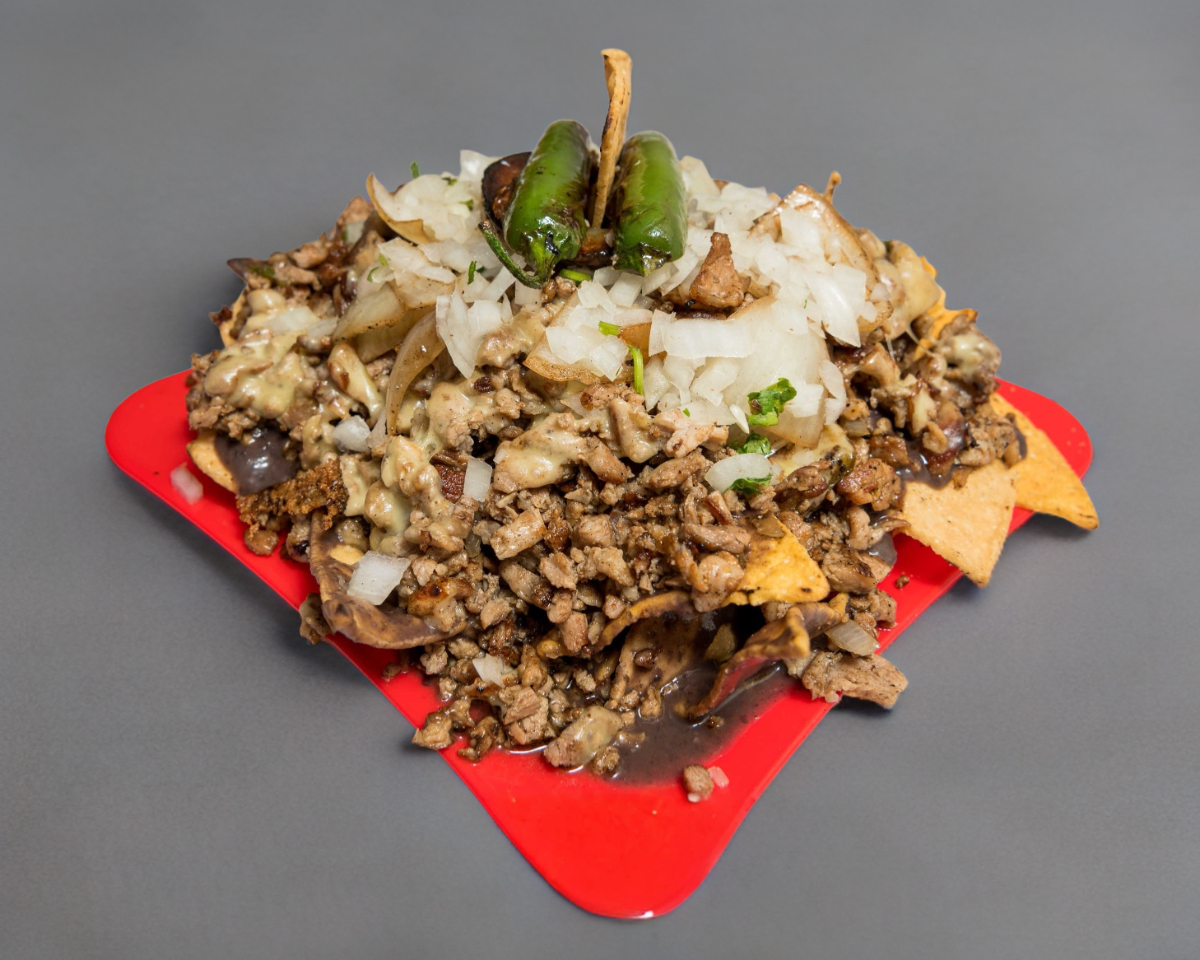 Nachos, tostada, frijol, queso, carne al pastor, jalapeños. Máximo para 2 personas